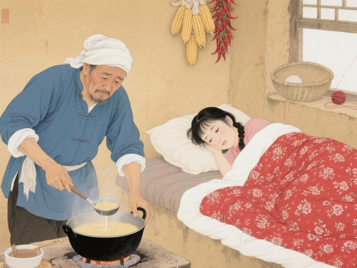 日头晒到炕沿了还不起,针线笸箩倒了都懒得扶。刘老栓在灶台忙得脚不沾地,烙好油饼、煮好小米粥,扯着嗓子喊:"翠莲!吃饭喽!"