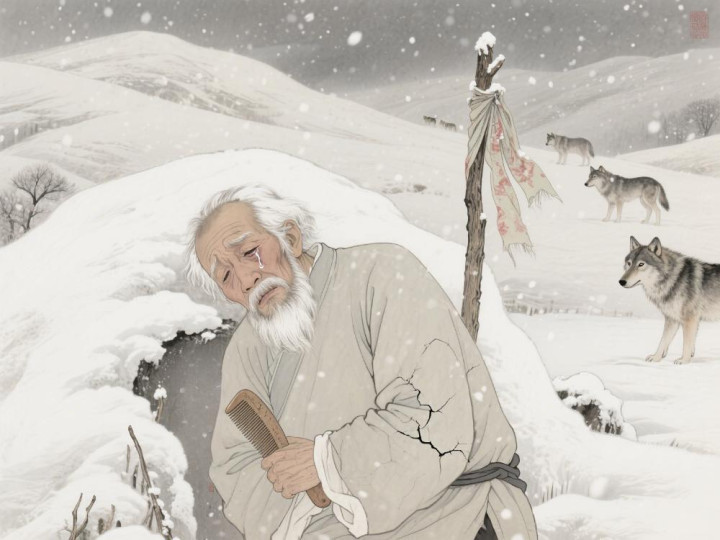 最后一夜,下着大雪。第二天乡亲们发现刘老栓冻僵在坟前,怀里紧紧揣着个裂了缝的木梳。