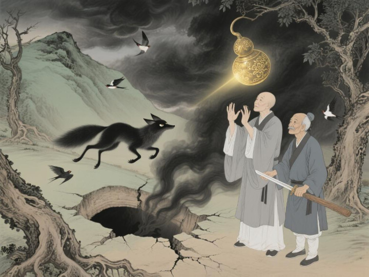 道士跌坐在地,嘴角流血:"不好... 那妖精丢了老窝,带着你闺女跑了..."